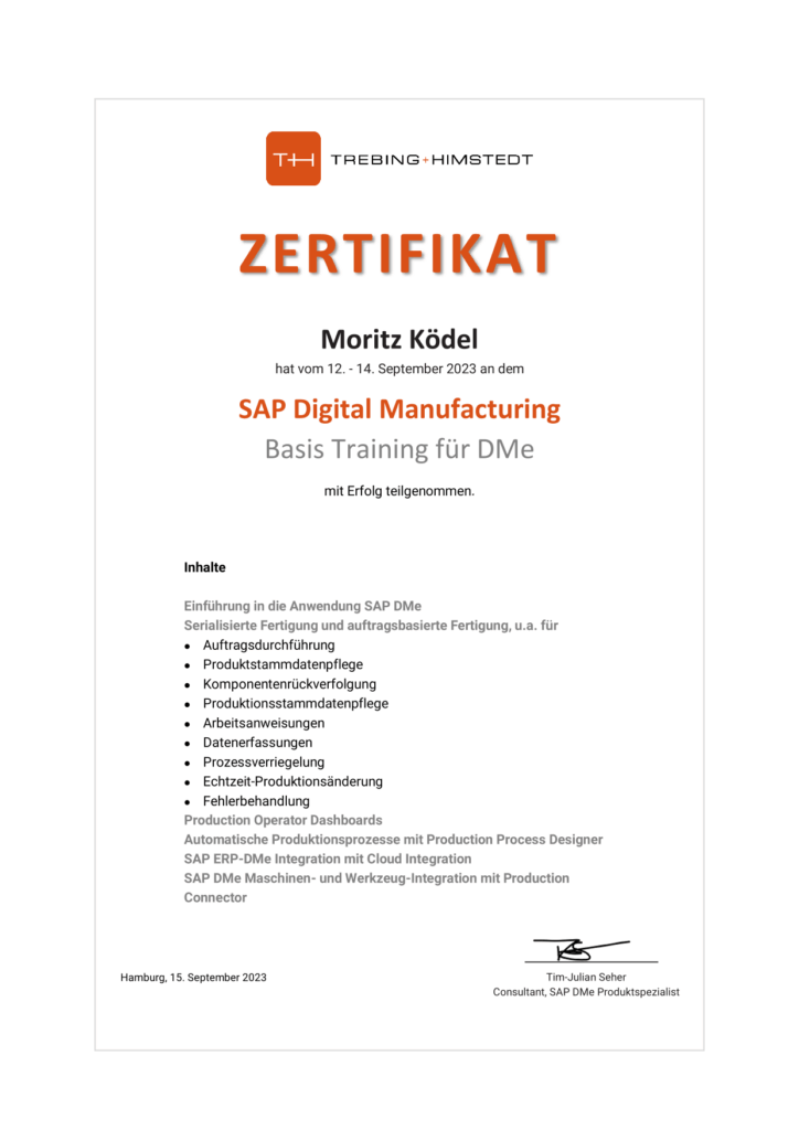 • SAP-Basiskompetenzen: Manufacturing Execution (SAP ME), Digital Manufacturing (SAP DM), Extended Warehouse Management (SAP EWM) und Enterprise Ressource Planning (SAP ERP)