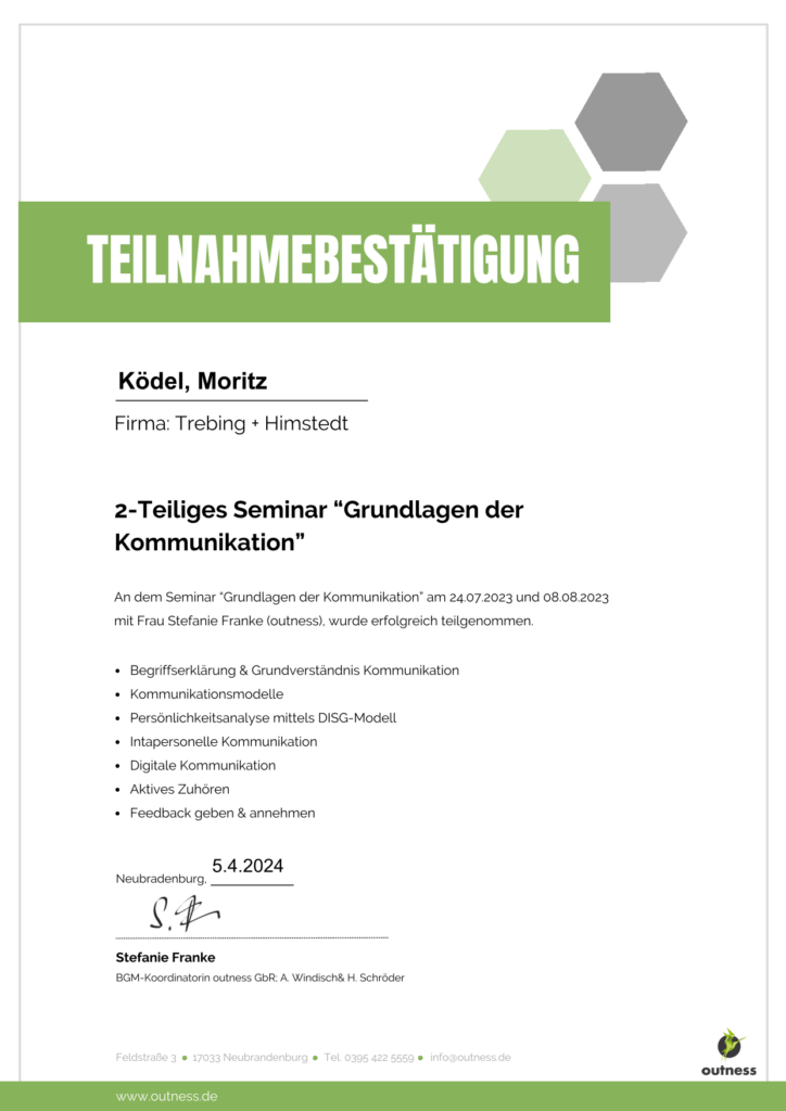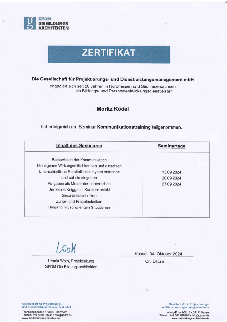 • Kommunikation & Teamwork: sicheres Auftreten, aktives Zuhören und konstruktives Feedback